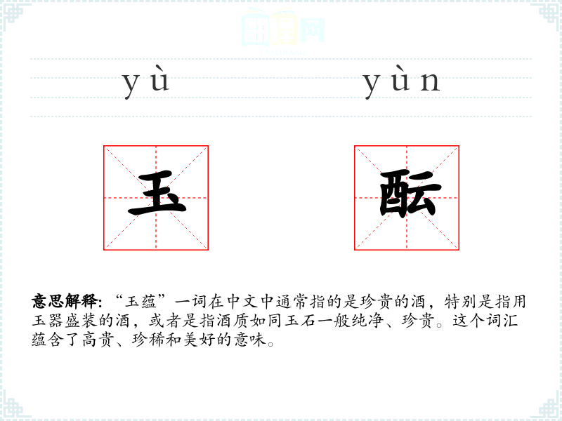 “玉蕴”一词在中文中通常指的是珍贵的酒,特别是指用玉器盛装的酒,或者是指酒质如同玉石一般纯净、珍贵。这个词汇蕴含了高贵、珍稀和美好的意味。