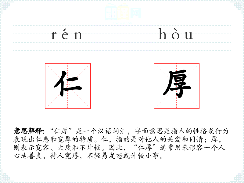 “仁厚”是一个汉语词汇,字面意思是指人的性格或行为表现出仁慈和宽厚的特质。仁,指的是对他人的关爱和同情;厚,则表示宽容、大度和不计较。因此,“仁厚”通常用来形容一个人心地善良,待人宽厚,不轻易发怒或计较小事。