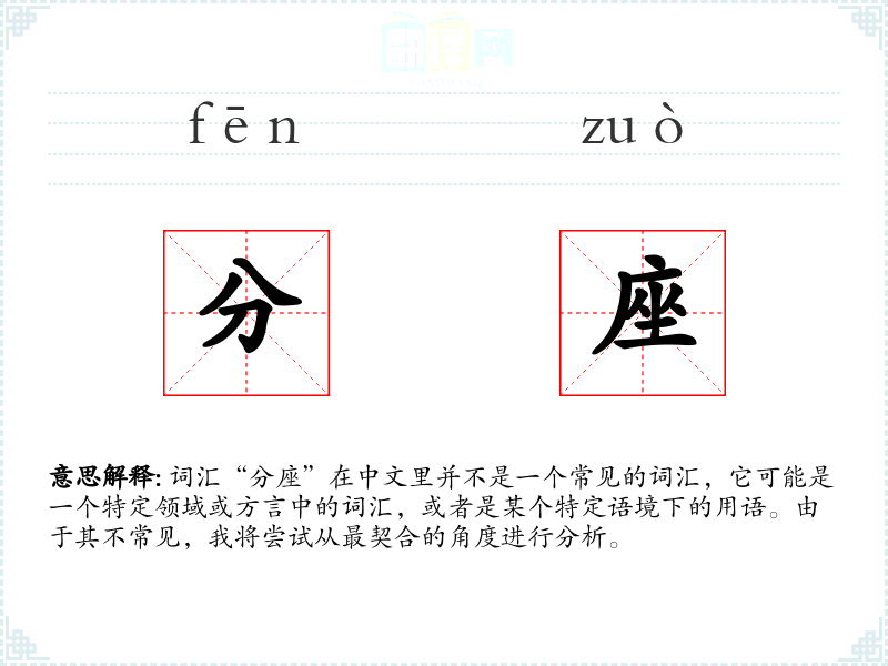 词汇“分座”在中文里并不是一个常见的词汇,它可能是一个特定领域或方言中的词汇,或者是某个特定语境下的用语。由于其不常见,我将尝试从最契合的角度进行分析。
