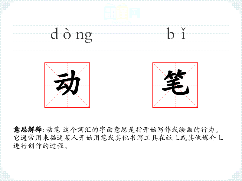 动笔 这个词汇的字面意思是指开始写作或绘画的行为。它通常用来描述某人开始用笔或其他书写工具在纸上或其他媒介上进行创作的过程。