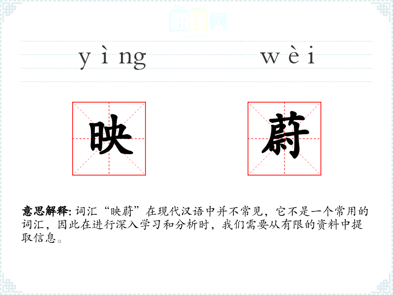 词汇“映蔚”在现代汉语中并不常见,它不是一个常用的词汇,因此在进行深入学*和分析时,我们需要从有限的资料中提取信息。