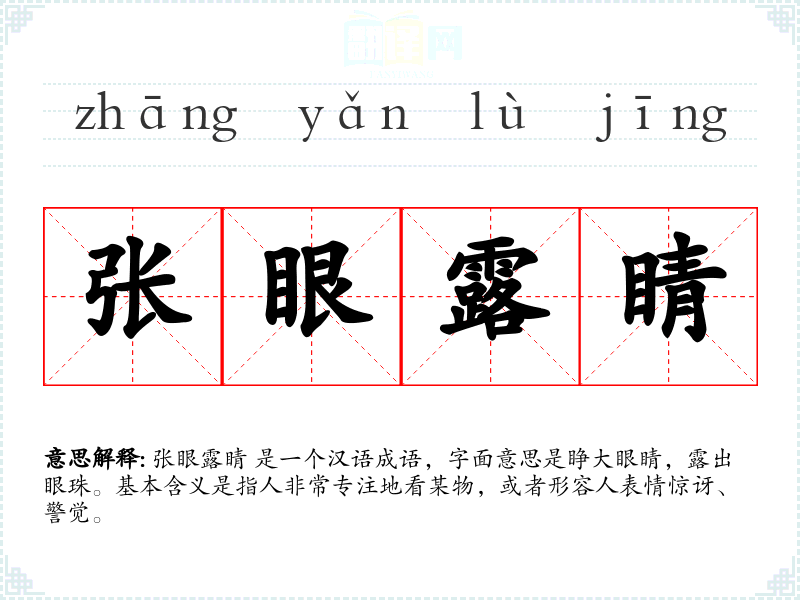 张眼露睛 是一个汉语成语,字面意思是睁大眼睛,露出眼珠。基本含义是指人非常专注地看某物,或者形容人表情惊讶、警觉。