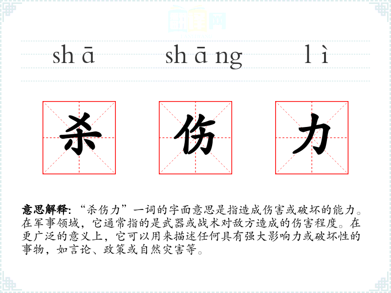 “杀伤力”一词的字面意思是指造成伤害或破坏的能力。在军事领域,它通常指的是武器或战术对敌方造成的伤害程度。在更广泛的意义上,它可以用来描述任何具有强大影响力或破坏性的事物,如言论、政策或自然灾害等。