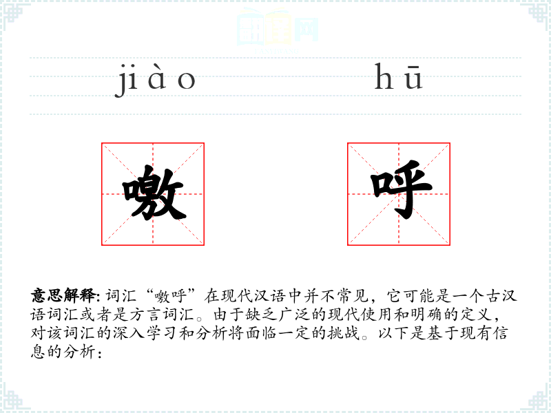 综上所述,由于“噭呼”在现代汉语中不常见且含义不明确,对其进行深入学习和分析存在较大困难。建议进一步查阅古代文献或方言资料,以获取更多信息。