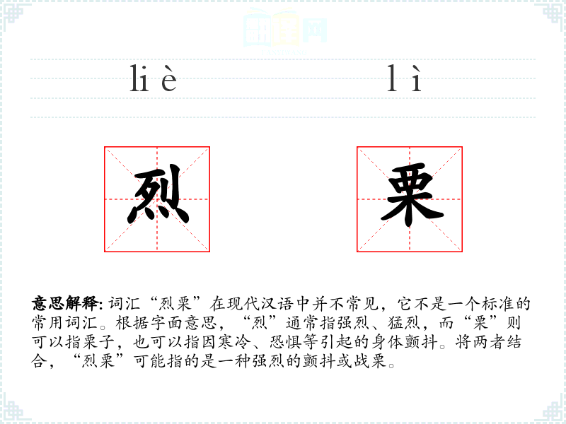 由于“烈栗”不是一个常用词汇,其词源和演变不太明确。可能是由“烈”和“栗”两个字组合而成,用以形容强烈的颤抖状态。