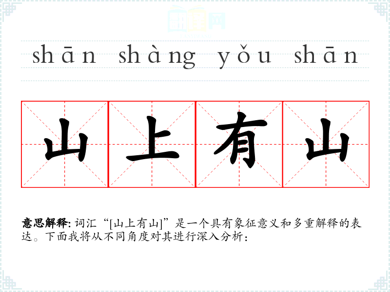 词汇“[山上有山]”是一个具有象征意义和多重解释的表达。下面我将从不同角度对其进行深入分析: