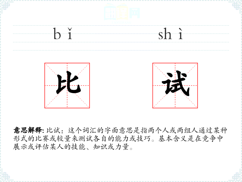 比试:这个词汇的字面意思是指两个人或两组人通过某种形式的比赛或较量来测试各自的能力或技巧。基本含义是在竞争中展示或评估某人的技能、知识或力量。