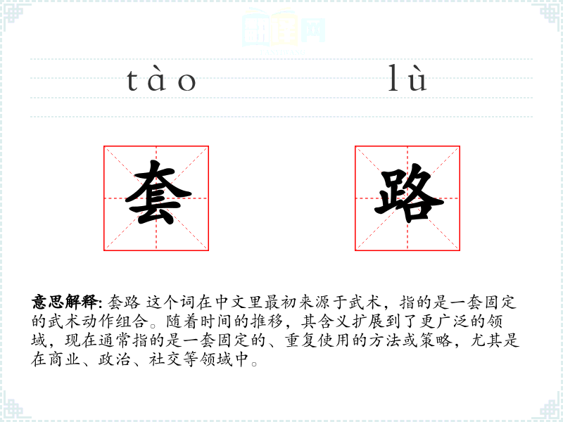 套路 这个词在中文里最初来源于武术,指的是一套固定的武术动作组合。随着时间的推移,其含义扩展到了更广泛的领域,现在通常指的是一套固定的、重复使用的方法或策略,尤其是在商业、政治、社交等领域中。