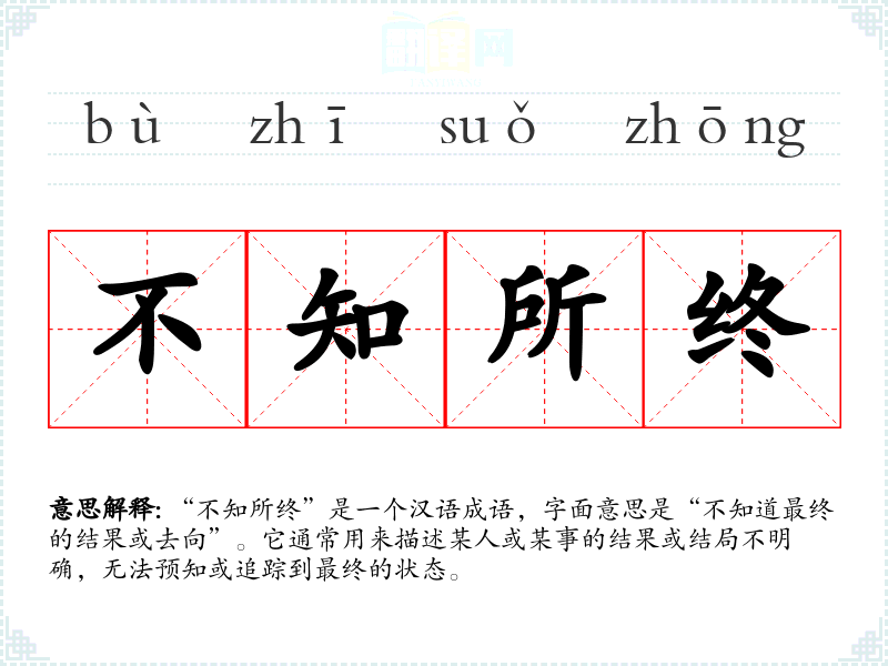 “不知所终”是一个汉语成语,字面意思是“不知道最终的结果或去向”。它通常用来描述某人或某事的结果或结局不明确,无法预知或追踪到最终的状态。