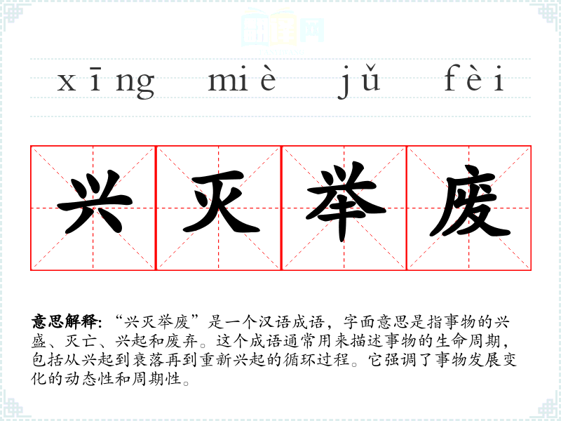 “兴灭举废”是一个汉语成语,字面意思是指事物的兴盛、灭亡、兴起和废弃。这个成语通常用来描述事物的生命周期,包括从兴起到衰落再到重新兴起的循环过程。它强调了事物发展变化的动态性和周期性。