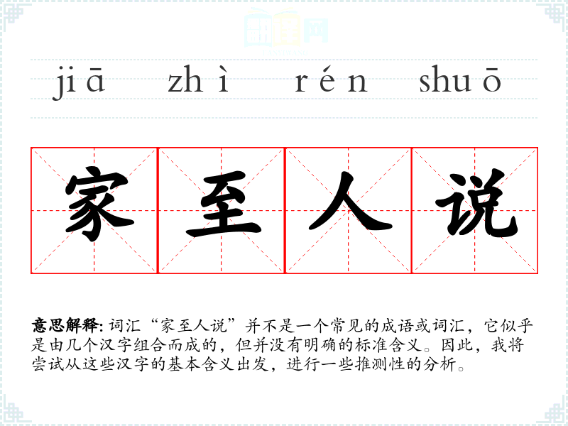 词汇“家至人说”并不是一个常见的成语或词汇,它似乎是由几个汉字组合而成的,但并没有明确的标准含义。因此,我将尝试从这些汉字的基本含义出发,进行一些推测性的分析。