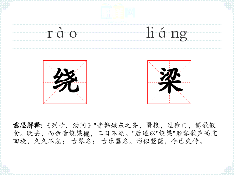 欐,三日不絶。"后遂以"绕梁"形容歌声高亢回旋,久久不息; 古琴名; 古乐器名。形似箜篌,今已失传。
