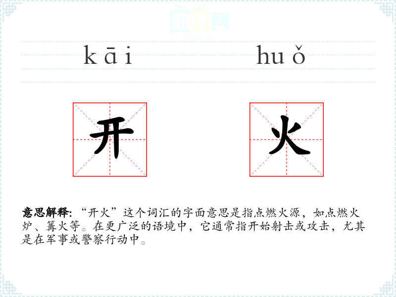 “开火”这个词汇的字面意思是指点燃火源,如点燃火炉、篝火等。在更广泛的语境中,它通常指开始射击或攻击,尤其是在军事或警察行动中。