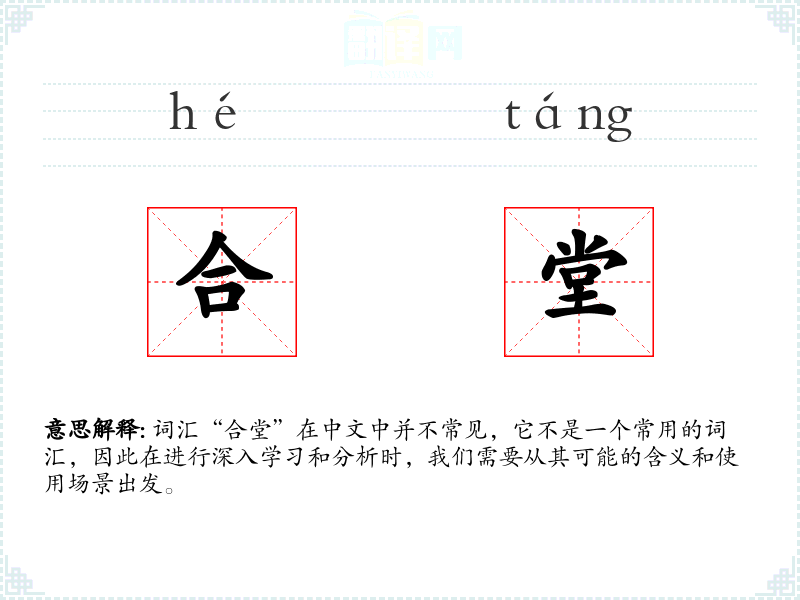 词汇“合堂”在中文中并不常见,它不是一个常用的词汇,因此在进行深入学*和分析时,我们需要从其可能的含义和使用场景出发。