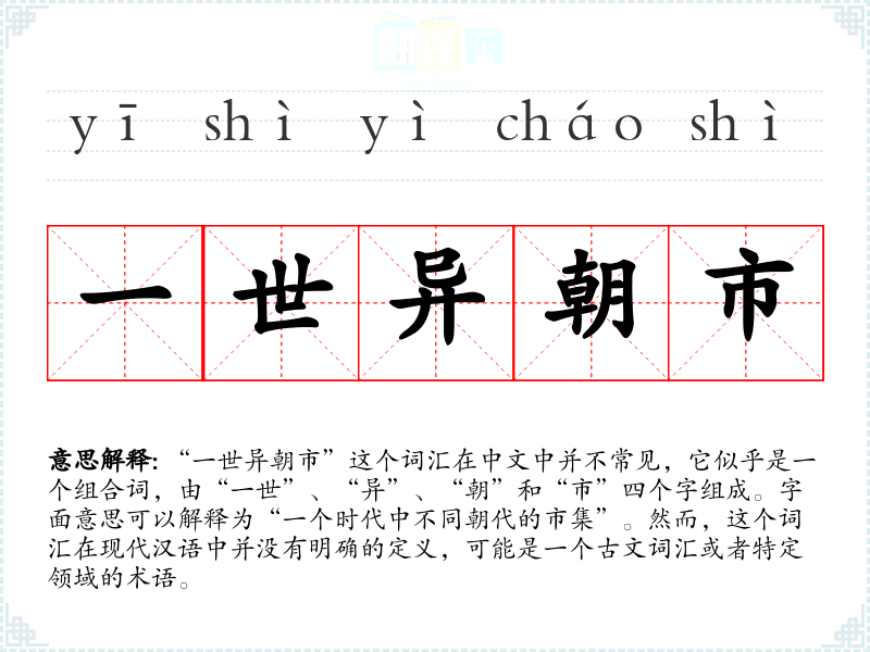 “一世异朝市”这个词汇在中文中并不常见,它似乎是一个组合词,由“一世”、“异”、“朝”和“市”四个字组成。字面意思可以解释为“一个时代中不同朝代的市集”。然而,这个词汇在现代汉语中并没有明确的定义,可能是一个古文词汇或者特定领域的术语。