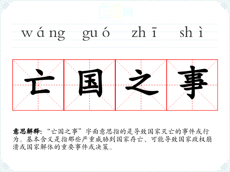 “亡国之事”字面意思指的是导致国家灭亡的或行为。基本含义是指那些严重威胁到国家存亡、可能导致国家政权崩溃或国家解体的重要或决策。