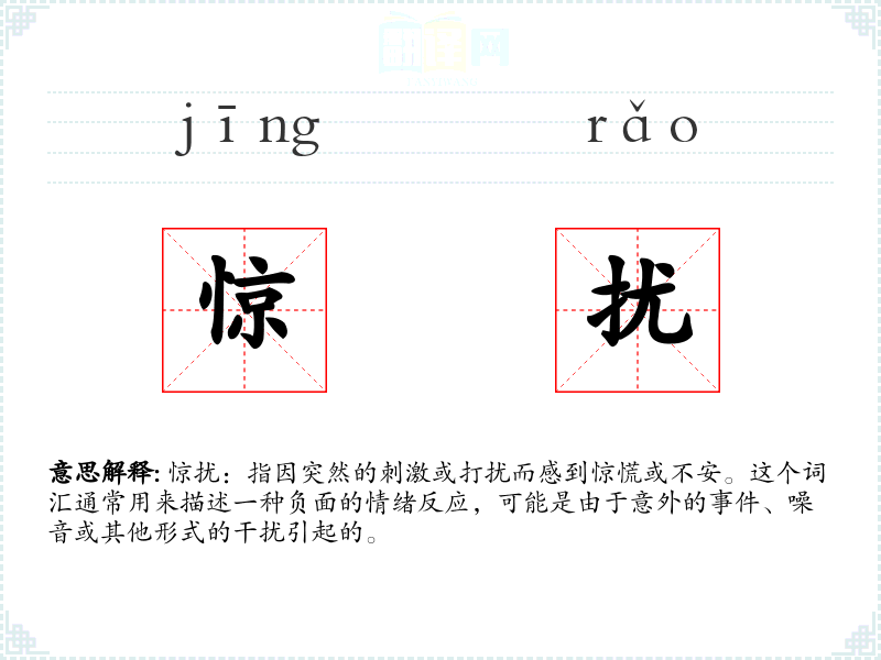 惊扰:指因突然的刺激或打扰而感到惊慌或不安。这个词汇通常用来描述一种负面的情绪反应,可能是由于意外的事件、噪音或其他形式的干扰引起的。