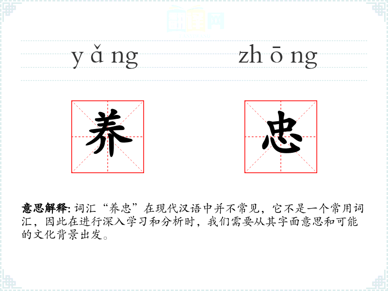 词汇“养忠”在现代汉语中并不常见,它不是一个常用词汇,因此在进行深入学*和分析时,我们需要从其字面意思和可能的文化背景出发。