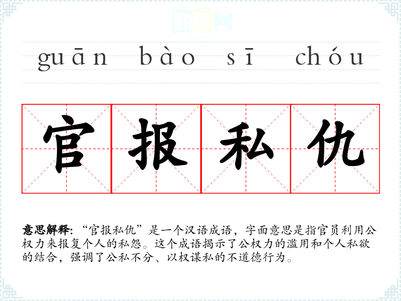 “官报私仇”是一个汉语成语,字面意思是指官员利用公权力来报复个人的私怨。这个成语揭示了公权力的滥用和个人私欲的结合,强调了公私不分、以权谋私的不道德行为。