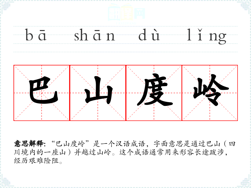 “巴山度岭”是一个汉语成语,字面意思是通过巴山(四川境内的一座山)并越过山岭。这个成语通常用来形容长途跋涉,经历艰难险阻。