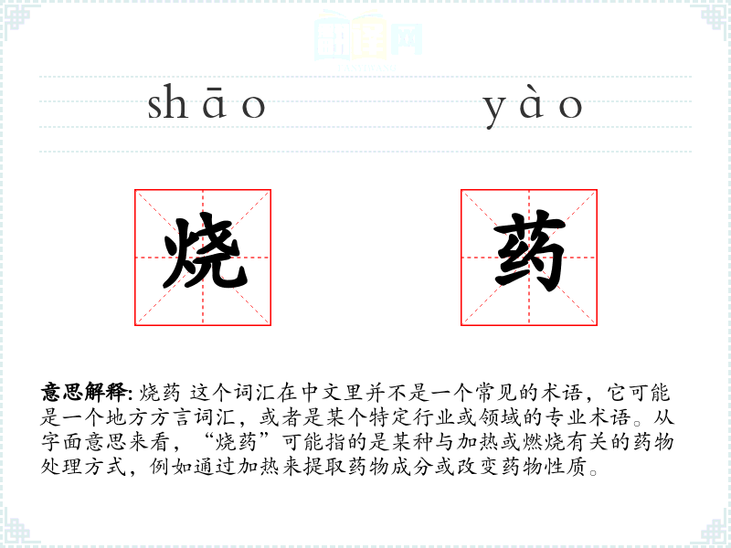- 反义词:无(由于“烧药”不是一个常用词汇,很难找到直接的反义词)