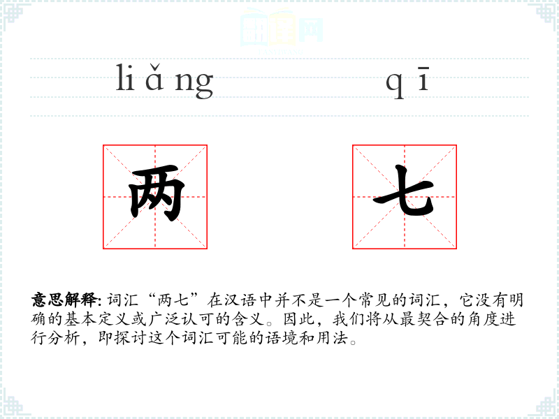 由于“两七”不是一个标准词汇,我们无法给出确切的基本定义。它可能是由数字“两”和“七”组合而成的,可能在某些特定语境中代表某种数量或顺序。