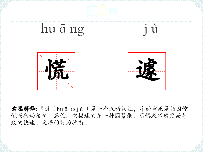 慌遽(huāng jù)是一个汉语词汇,字面意思是指因惊慌而行动匆忙、急促。它描述的是一种因紧张、恐惧或不确定而导致的快速、无序的行为状态。