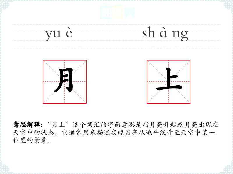 “月上”这个词汇的字面意思是指月亮升起或月亮出现在天空中的状态。它通常用来描述夜晚月亮从地平线升至天空中某一位置的景象。
