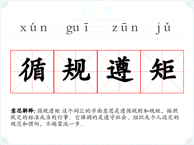 循规遵矩 这个词汇源于汉语,其构成部分“循”和“遵”都有遵循的意思,“规”和“矩”则分别指规则和规矩。在古代汉语中,这个词汇就已经存在,并且在现代汉语中仍然广泛使用,没有发生太大变化。
