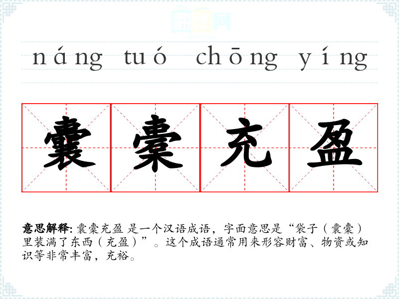 囊橐充盈 是一个汉语成语,字面意思是“袋子(囊橐)里装满了东西(充盈)”。这个成语通常用来形容财富、物资或知识等非常丰富,充裕。