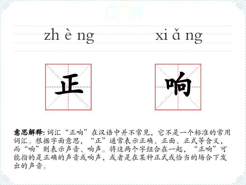 由于“正响”不是一个常用词汇,其词源和历史演变不详。可能是由“正”和“响”两个常用词汇组合而成,用以表达特定的声音状态。