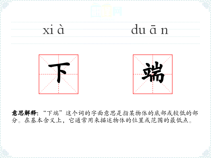 “下端”这个词的字面意思是指某物体的底部或较低的部分。在基本含义上,它通常用来描述物体的位置或范围的最低点。