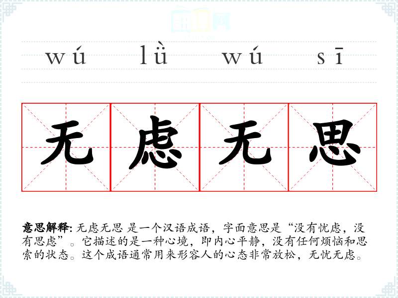 无虑无思 是一个汉语成语,字面意思是“没有忧虑,没有思虑”。它描述的是一种心境,即内心平静,没有任何烦恼和思索的状态。这个成语通常用来形容人的心态非常放松,无忧无虑。