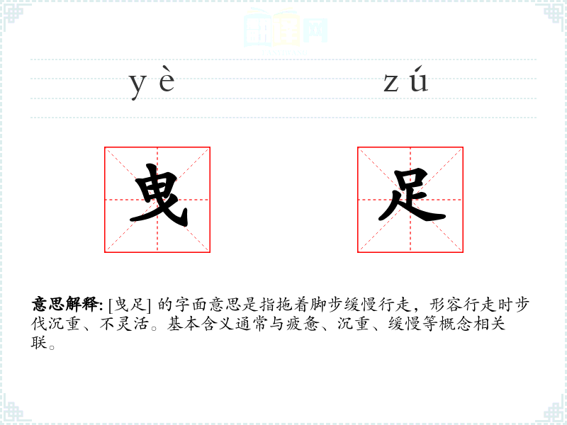 [曳足] 的字面意思是指拖着脚步缓慢行走,形容行走时步伐沉重、不灵活。基本含义通常与疲惫、沉重、缓慢等概念相关联。