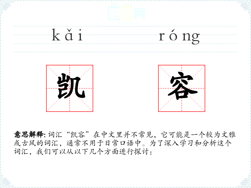 词汇“凯容”在中文里并不常见,它可能是一个较为文雅或古风的词汇,通常不用于日常口语中。为了深入学*和分析这个词汇,我们可以从以下几个方面进行探讨: