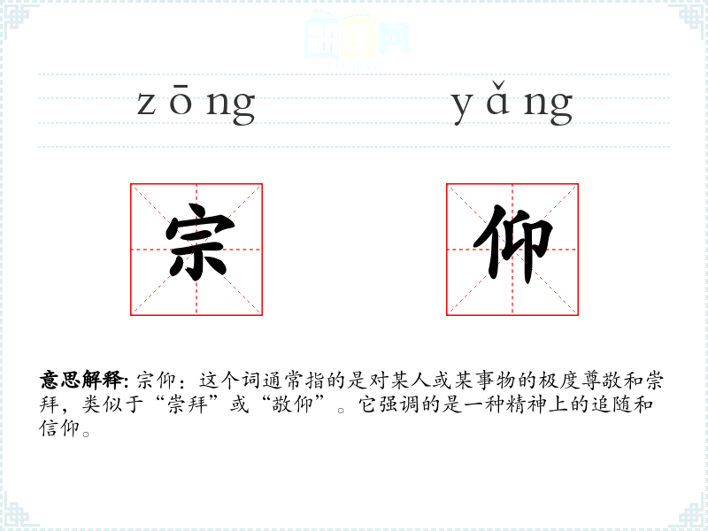 宗仰:这个词通常指的是对某人或某事物的极度尊敬和崇拜,类似于“崇拜”或“敬仰”。它强调的是一种精神上的追随和信仰。