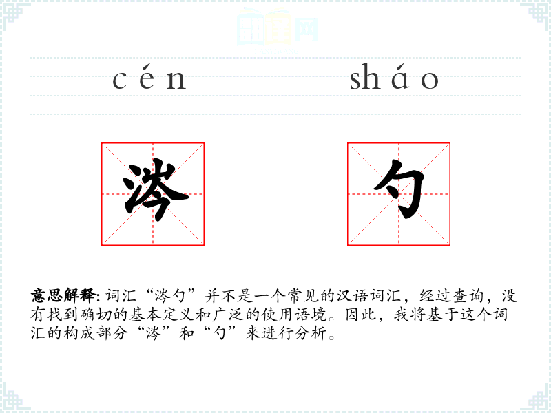 词汇“涔勺”并不是一个常见的汉语词汇,经过查询,没有找到确切的基本定义和广泛的使用语境。因此,我将基于这个词汇的构成部分“涔”和“勺”来进行分析。