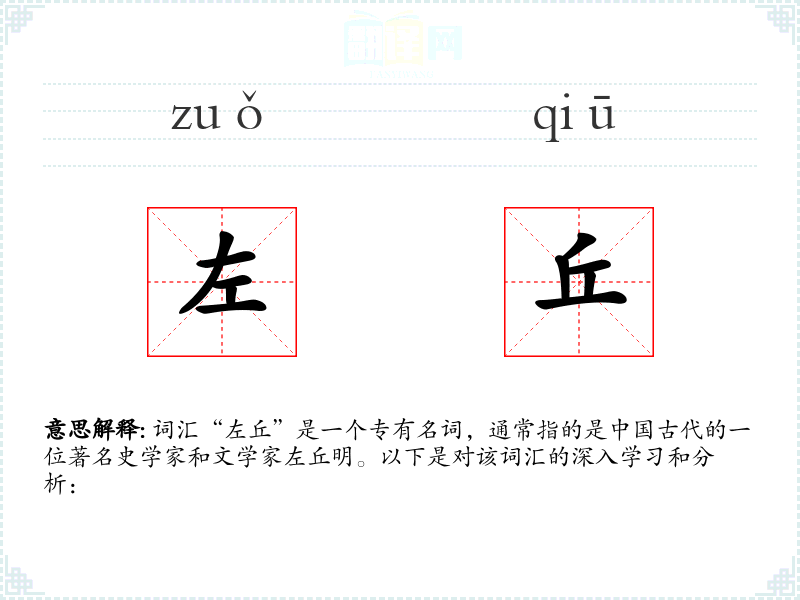 词汇“左丘”是一个专有名词,通常指的是*古代的一位著名史学家和文学家左丘明。以下是对该词汇的深入学和分析: