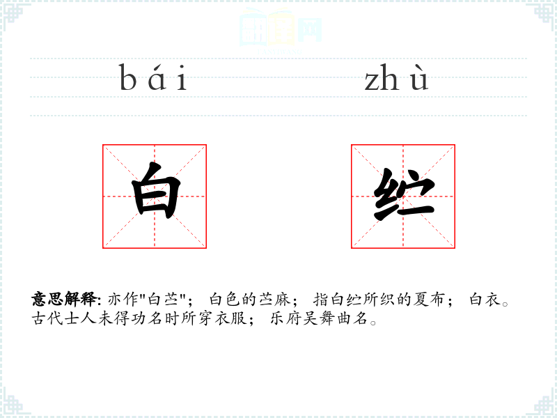 亦作"白苎"; 白色的苎麻; 指白纻所织的夏布; 白衣。古代士人未得功名时所穿衣服; 乐府吴舞曲名。