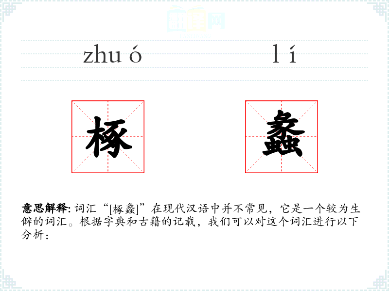 词汇“[椓蠡]”在现代汉语中并不常见,它是一个较为生僻的词汇。根据字典和古籍的记载,我们可以对这个词汇进行以下分析: