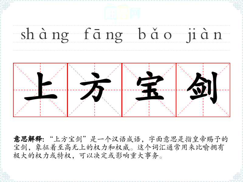 “上方宝剑”是一个汉语成语,字面意思是指**赐予的宝剑,象征着至高无上的权力和权威。这个词汇通常用来比喻拥有极大的权力或特权,可以决定或影响重大事务。
