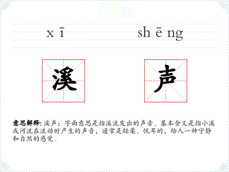 - 反义词:静寂、无声、沉寂(这些词与溪声的动态和声音特性形成对比)
