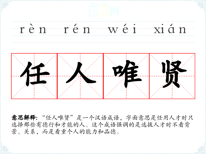 “任人唯贤”是一个汉语成语,字面意思是任用人才时只选择那些有德行和才能的人。这个成语强调的是选拔人才时不看背景、关系,而是看重个人的能力和品德。