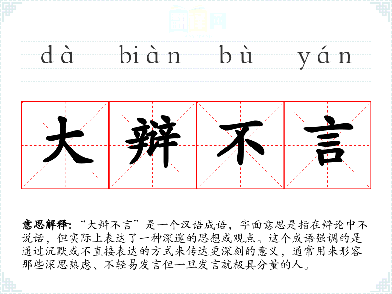 “大辩不言”是一个汉语成语,字面意思是指在辩论中不说话,但实际上表达了一种深邃的思想或观点。这个成语强调的是通过沉默或不直接表达的方式来传达更深刻的意义,通常用来形容那些深思熟虑、不轻易发言但一旦发言就极具分量的人。