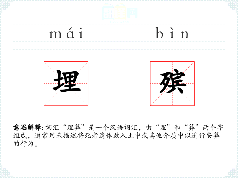 词汇“埋葬”是一个汉语词汇,由“埋”和“葬”两个字组成,通常用来描述将死者遗体放入土中或其他介质中以进行安葬的行为。