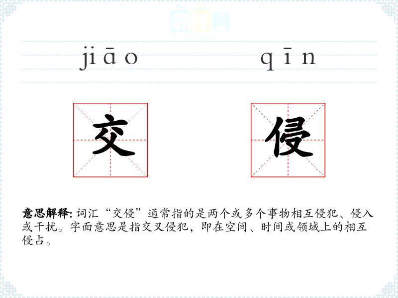 “交侵”这个词由“交”和“侵”两个字组成。在古代汉语中,“交”有相互、交叉的意思,“侵”则指侵犯、侵入。随着语言的发展,这个词逐渐被用来描述各种形式的相互侵犯或干扰。