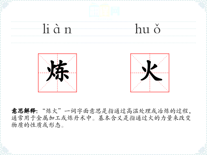 “炼火”一词字面意思是指通过高温处理或冶炼的过程,通常用于金属加工或炼丹术中。基本含义是指通过火的力量来改变物质的性质或形态。