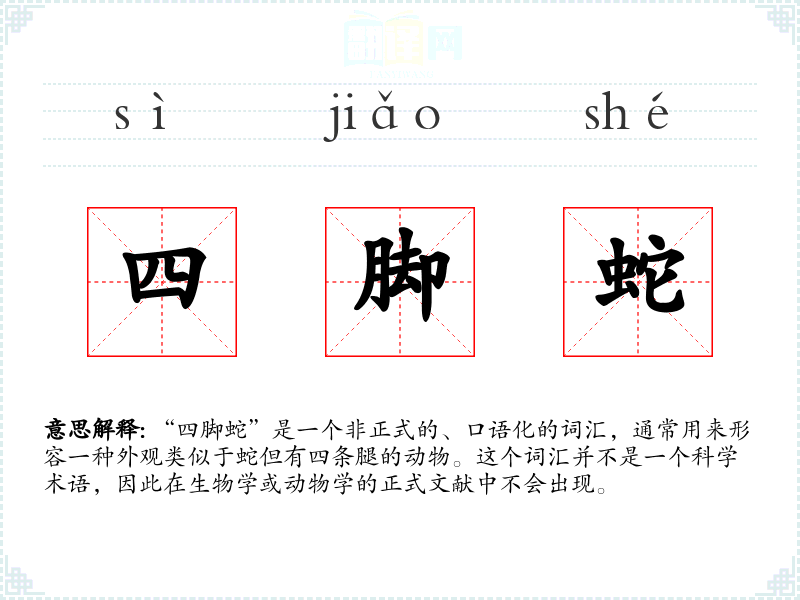 “四脚蛇”是一个非正式的、口语化的词汇,通常用来形容一种外观类似于蛇但有四条腿的动物。这个词汇并不是一个科学术语,因此在生物学或动物学的正式文献中不会出现。