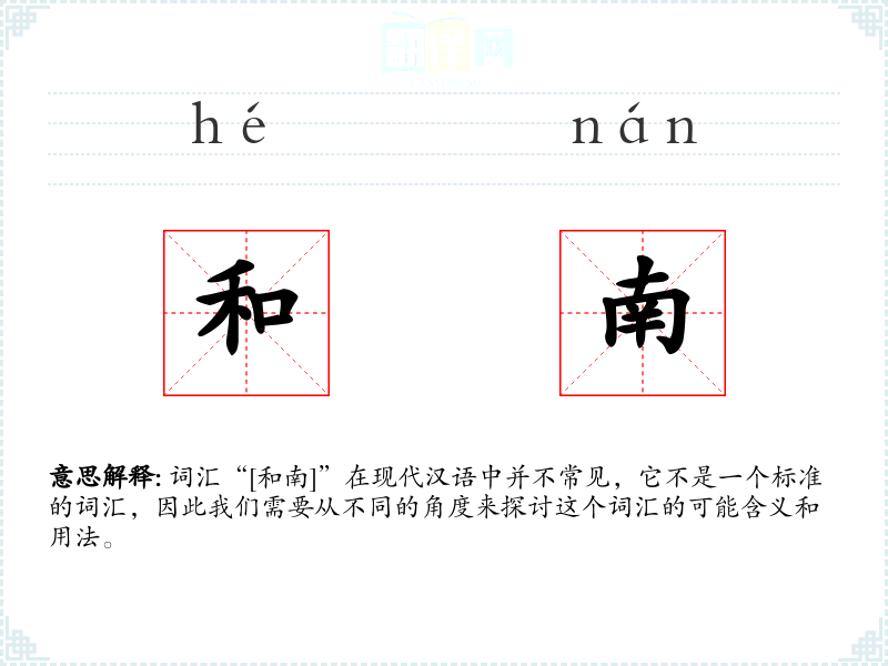 由于“[和南]”不是一个标准的汉语词汇,我们无法给出一个确切的字面意思和基本含义。它可能是某个特定领域或方言中的词汇,或者是某个特定文化背景下的用语。