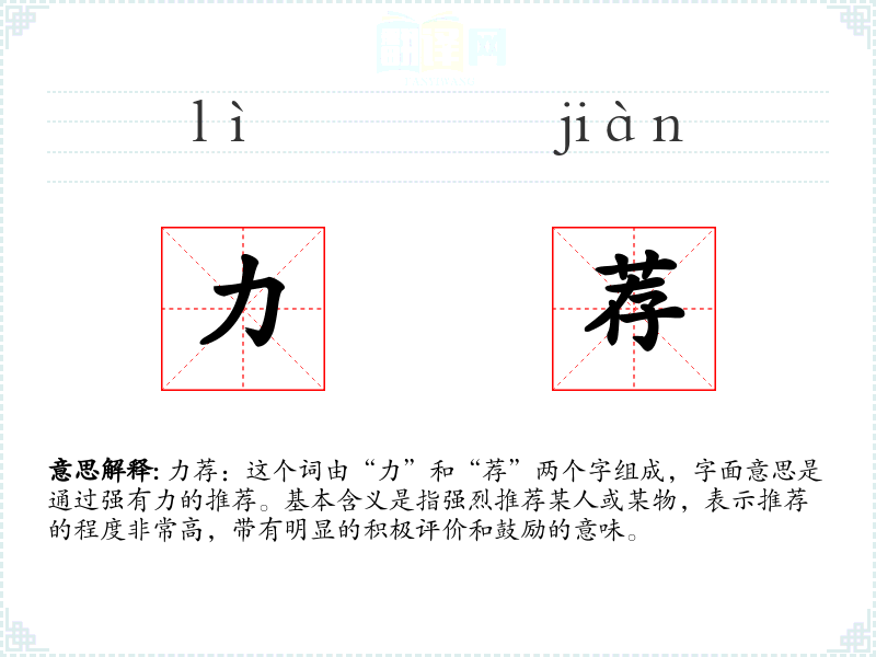 力荐:这个词由“力”和“荐”两个字组成,字面意思是通过强有力的推荐。基本含义是指强烈推荐某人或某物,表示推荐的程度非常高,带有明显的积极评价和鼓励的意味。